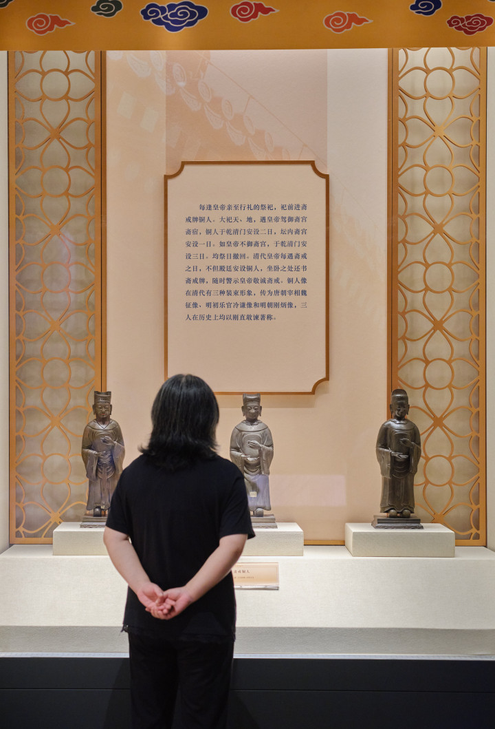 有三件清斋戒铜人像如今也摆放在展柜里。他们立像戴冠,左手向胸,右手平抬向上,作抱持状,脚下还有方形底座。据记载,斋戒铜人像在清代有三种装束形象,据传一为唐朝宰相魏征像,一为明初乐官冷谦像,另一为明朝刚炳像。三人在历史上均以刚直敢谏著称。