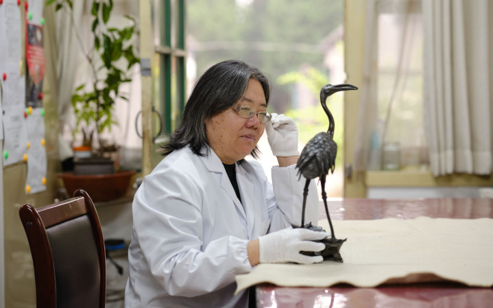 一尊铜立鹤被小心翼翼从囊匣里取出来。鹤身通体发黑,泛着光亮。鹤首朝一侧歪着,两条干瘦的腿杵在铜底座上,像镊子般细长的嘴也微微张开。五年前,这只鹤可没这么神气,它双腿折断,羽翼粘连,还染上了一身“皮肤病”。