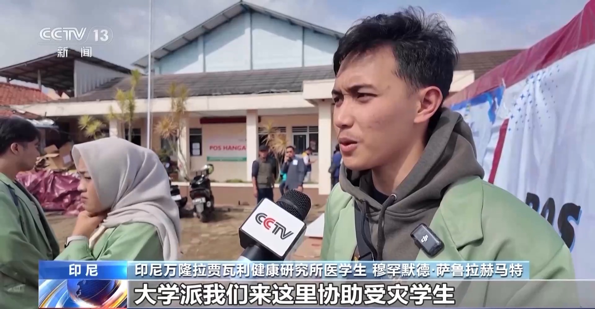 印尼万隆拉贾瓦利健康研究所医学生 穆罕默德·萨鲁拉赫马特:大学派我们来这里协助受灾学生,我们一行约60人,目前有9人在执行任务。我们给灾民进行检查,灾民人数众多,他们有的受轻伤,有的受中度伤。
